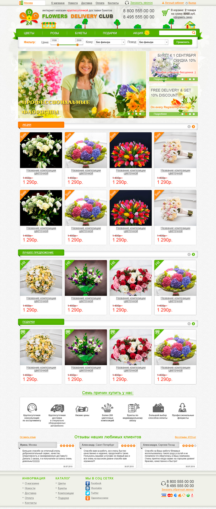 Главная страница при наведении мышки на элементы страницы.