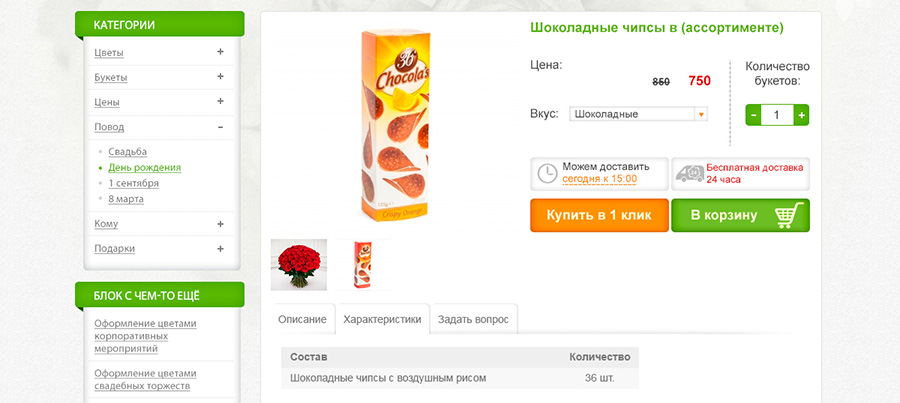 Карточка товара (для подарков с выбором вкусов).