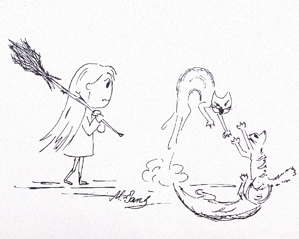 Я поспешила туда, прихватив по дороге метлу. И с ней наперевес распахнула приоткрытую дверь. В комнате действительно бесновались звери, наш чёрный кот и парочка серых, похожих на дым, чуть крупнее размером. И пришлые коты кажется одерживали победу. Так что, не долго думая, махнула на них метлой... И они рассеялись... Ну прям буквально дымчатые оказались...