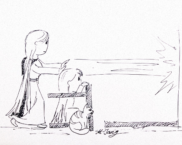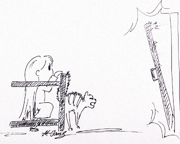 Наконец, к вечеру рисунок был полностью восстановлен. Но Эаланда не возвращалась... Зато снаружи послышался шорох на крыльце. Мы с котом переглянулись и на секунду мне показалась радость в его взгляде, потому было бросилась к дверям встречать хозяйку дома. Но в коридоре кот обогнал меня и выгнув спину зашипел. Это был явно не хороший знак, так что я поспешила вернуться за метлой.