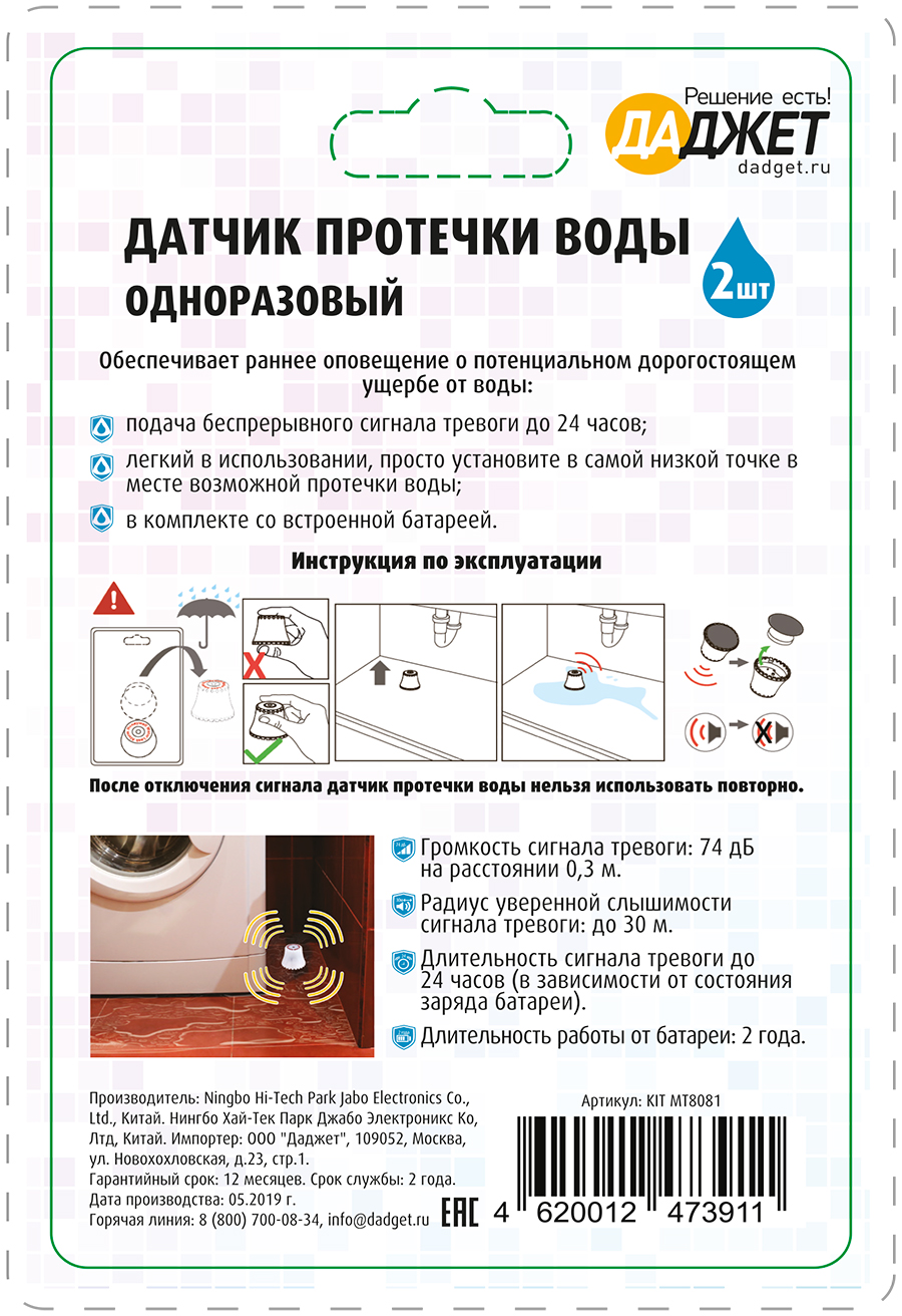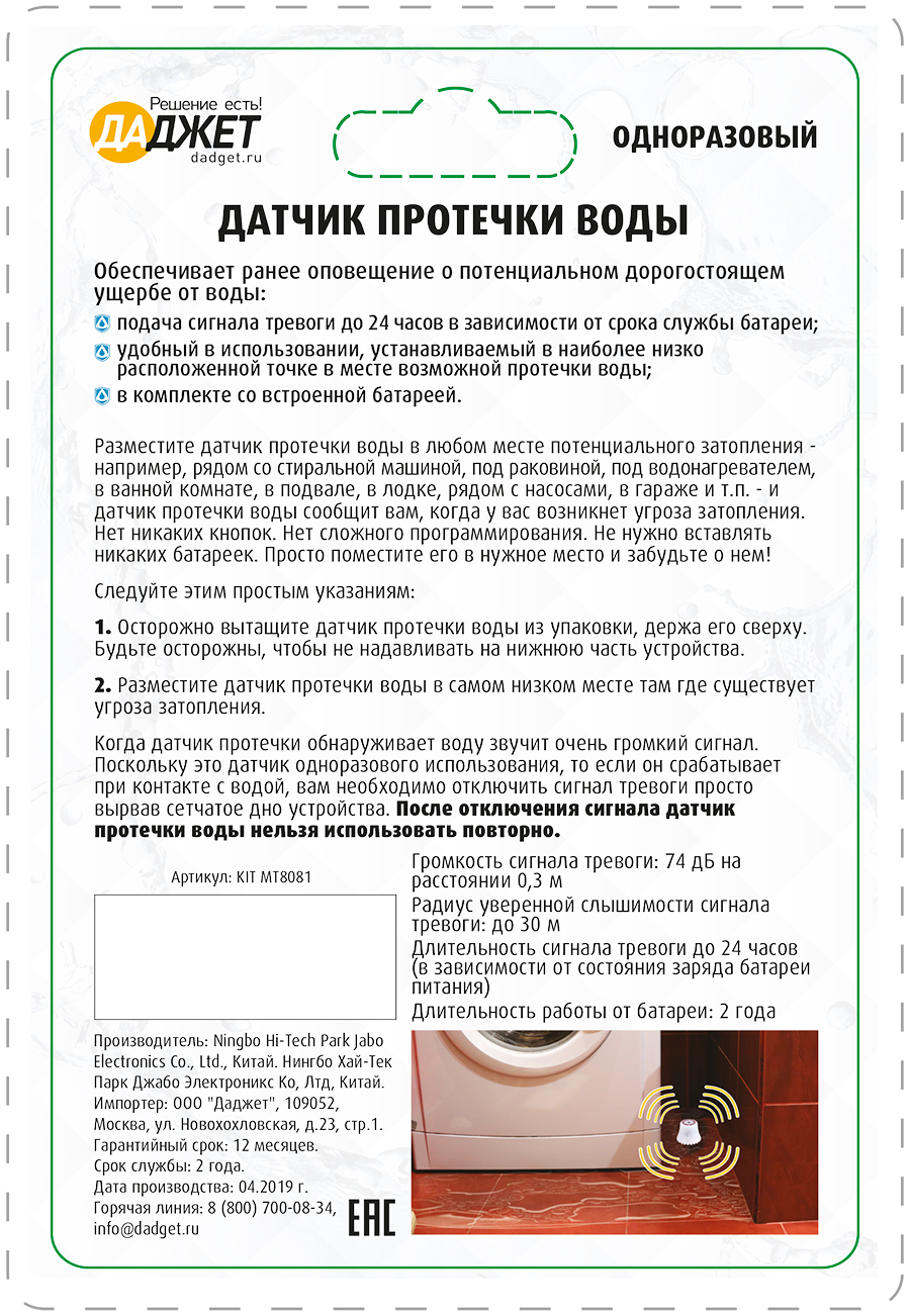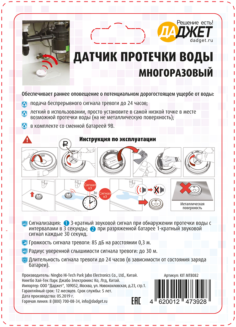 Финальный дизайн упаковки для многороазового датчика протечки воды (обратная сторона).