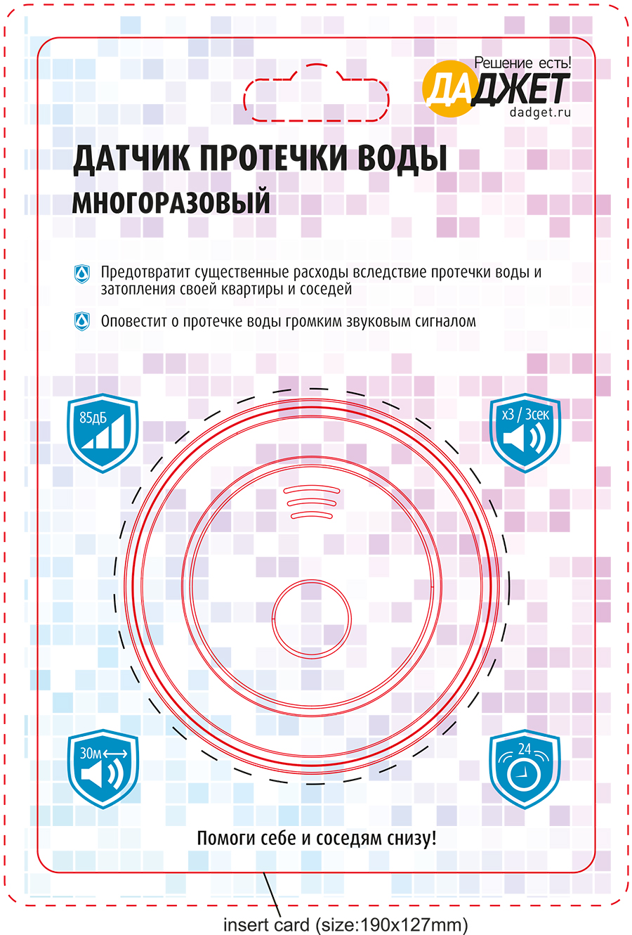 Финальный дизайн упаковки для многоразового датчика протечки воды (лицевая сторона).