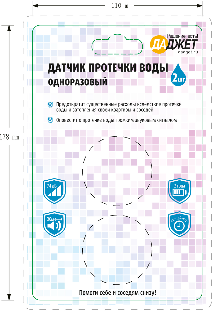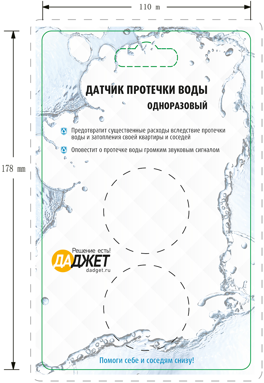 Финальный дизайн упаковки для одноразового датчика протечки воды (лицевая сторона).
