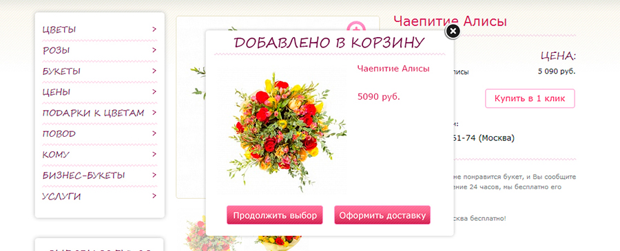 Всплывающее окно (добавлено в корзину).