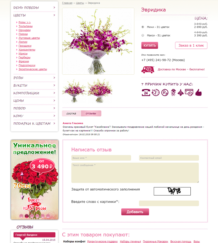 Карточка товара (дополнительные вкладки с описанием, выполнение рекомендаций по СЕО), отзывы.