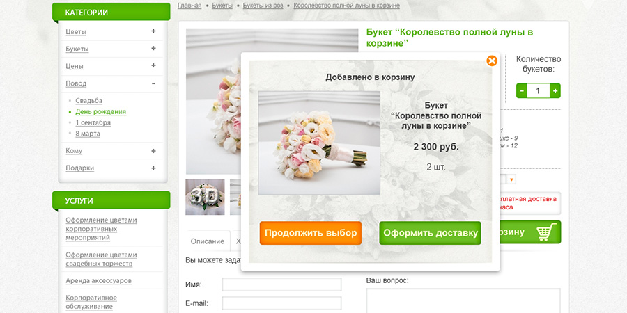Карточка товара. Всплывающее окошко "добавлено в корзину".