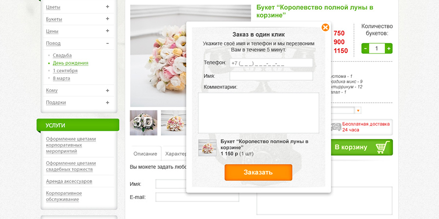 Карточка товара. Всплывающее окошко "заказ в 1 клик".