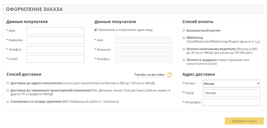 Действия в блоке оформления заказа.